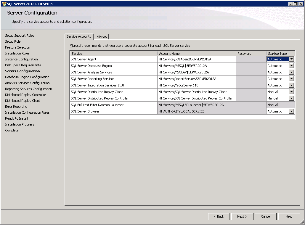 11. Server configuration – You can observe new service account options for Distributed Replay client and controller.As this is a test case I am opting Local accounts –