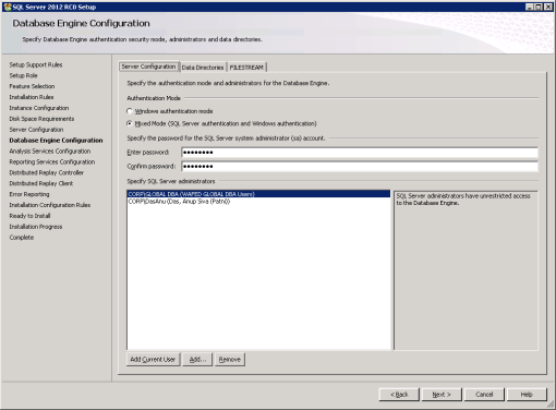 12. Database engine configuration – No changes for this screen and opted mixed mode with a strong SA password –