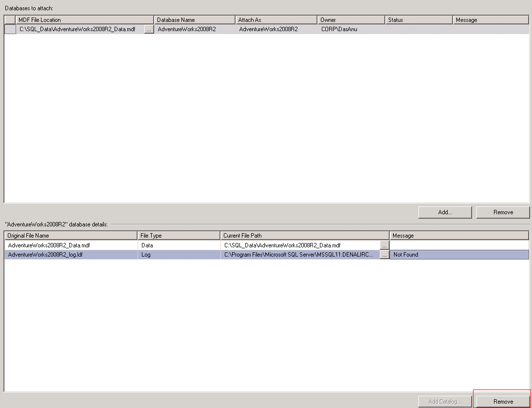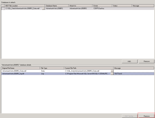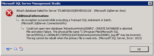 File activation failure. The physical file name “C:\Program Files\Microsoft SQL Server\MSSQL11.DENALIRCO\MSSQL\DATA\AdventureWorks2008R2_log.ldf” may be incorrect.