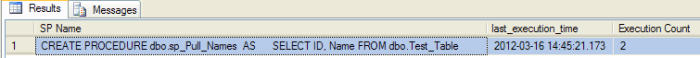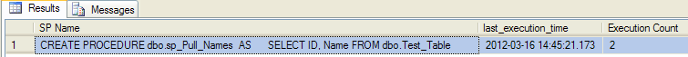 SELECT QT.[text] AS [SP Name], QS.last_execution_time, QS.execution_count AS [Execution Count] FROM sys.dm_exec_query_stats AS QS CROSS APPLY sys.dm_exec_sql_text(qs.sql_handle) AS QT WHERE QT.dbid = db_id() -- Filter by current database AND QT.text LIKE '%dbo.sp_Pull_Names%'