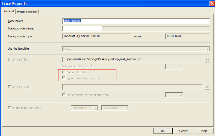 Before we get into the details,I would like to mention that the max_files column means the maximum number of rollover files.When we create a trace we have the option to enable file roll over,which simply means that if the first trace file size is set as 5MB,then after reaching that limit sql profiler will create another file to continue capturing the trace.This will continue until and unless the trace is stopped.