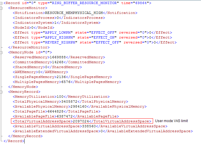 To double check the VAS details you need to query this DMV with a condition for ring_buffer_type = RING_BUFFER_RESOURCE_MONITOR. This allows you to see memory state changes due to various types of memory pressure.