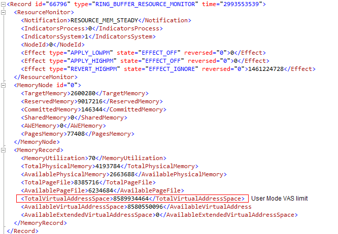 Below are the captured view of XML records for both x86 and x64 bit versions of SQL Server.You can clearly understand the VAS limit from this.