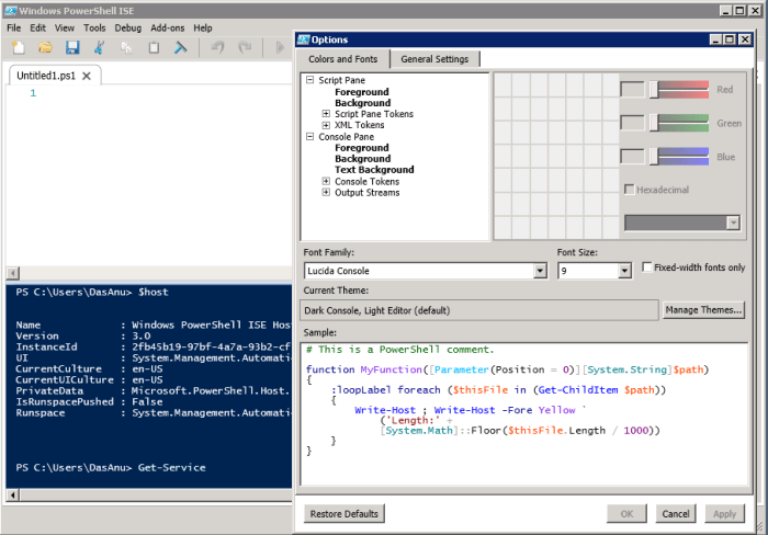 There is some customization available for the ISE under Tools section. The below screen shows customization for the scripting pane.