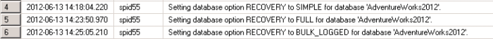 Initially the database for this test case Adventureworks2012 was running Full recovery model and I changed it to Simple, Full and then Bulk Logged.
