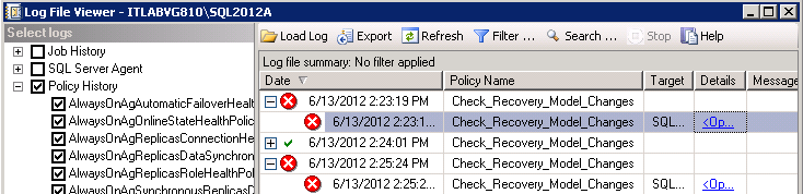 The second policy evaluation success message is when the recovery model was changed to Full.