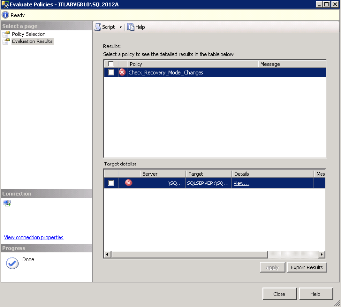 If we want to evaluate the policy manually we can do that too.if we opt to do a manual evaluation then we will get the evaluation details which will clearly says that database Adventureworks2012 is having a different recovery model than what is mentioned in the policy.
