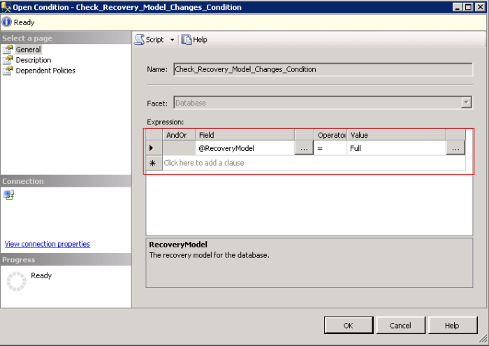 The condition@RecoveryModel = Full is just one value for creating a condition, so that we can evaluate the policy.