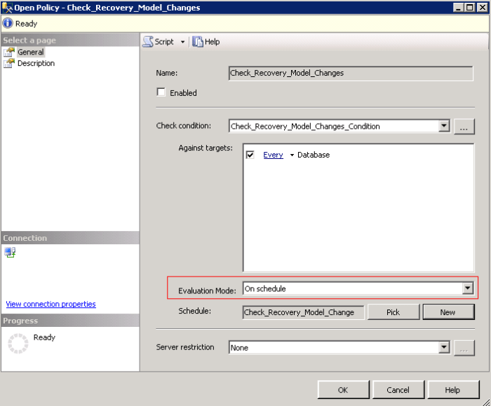 A policy was created for all the databases with evaluation mode was ‘On Schedule’