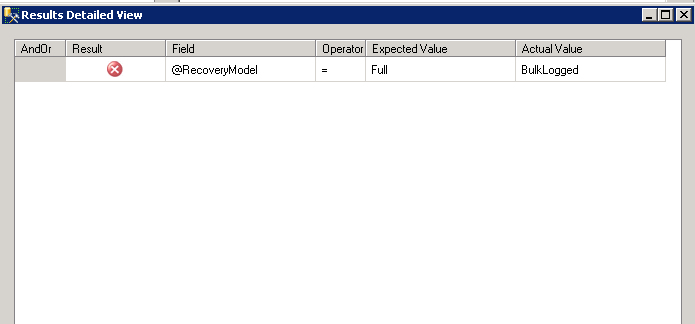 The first policy deviation was when the database was set as Simple recovery model.If we click the hyperlink under Detail section we will get the details of actual value and expected value.