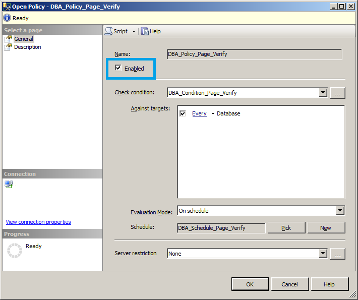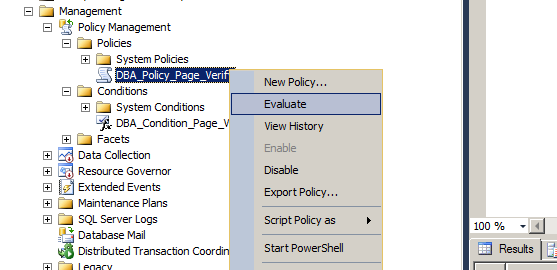 The idea is to have the schedule run every Sunday to check if there are any databases which are violating the rule of page verify = checksum and on Monday morning when we come to work we will just need to check history of the policy to see if there are any violations.