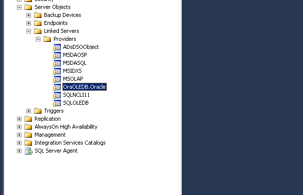 Step 3 – Without rebooting the server or recycling the SQLServices you will open SSMS and connect to the instance and see that the oracle provider is available.