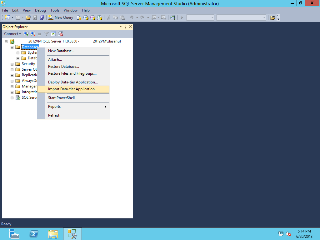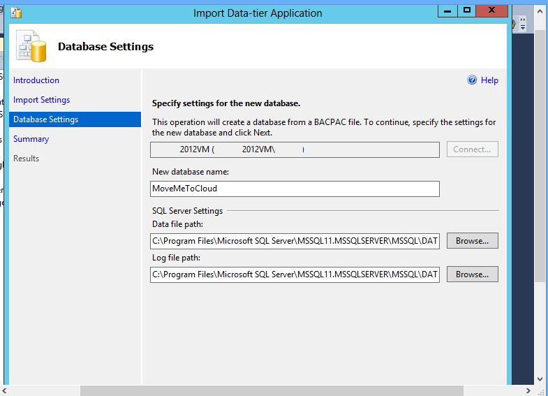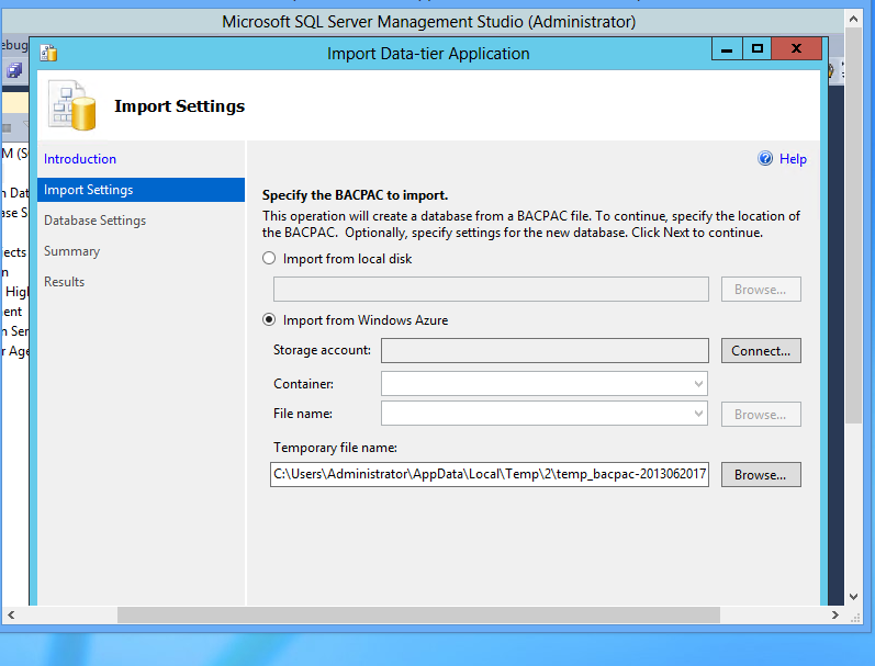 We will connect to a Windows Azure Virtual Machine which is running SQL Server 2012 up in Azure to do the import.