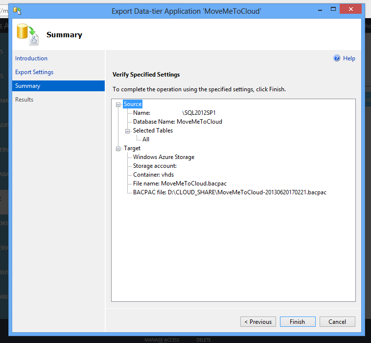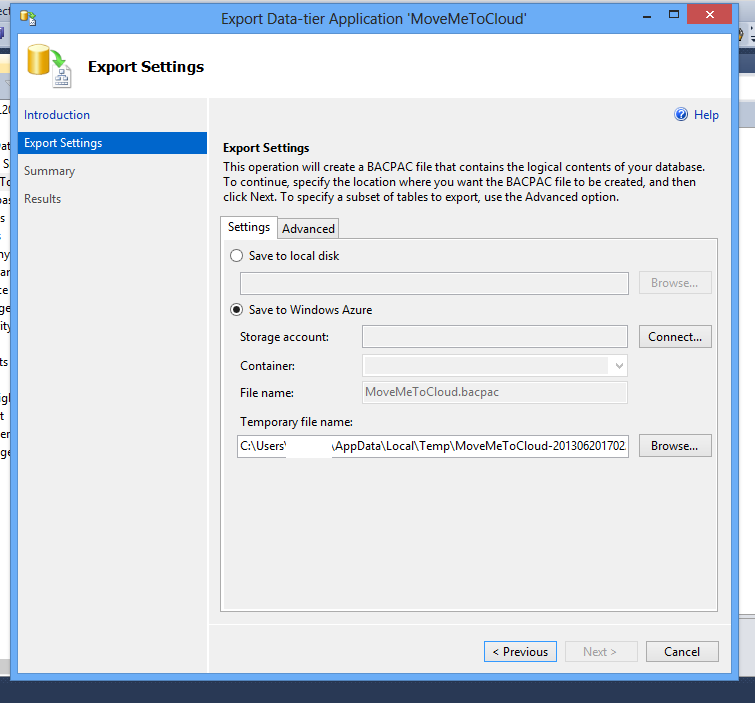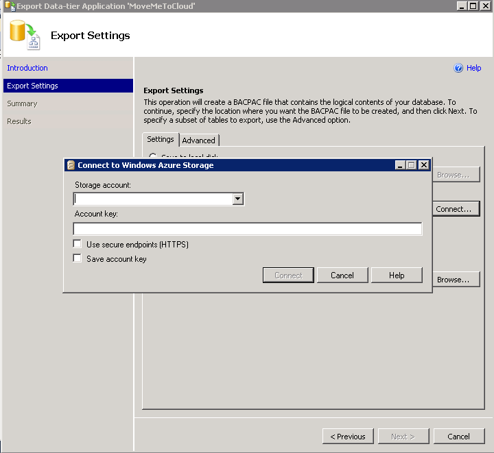 In this step we will connect Windows Azure Storage Account and we will export the BACPAC directly to the cloud storage.