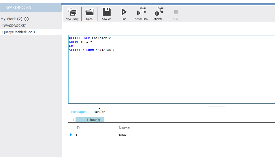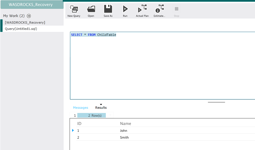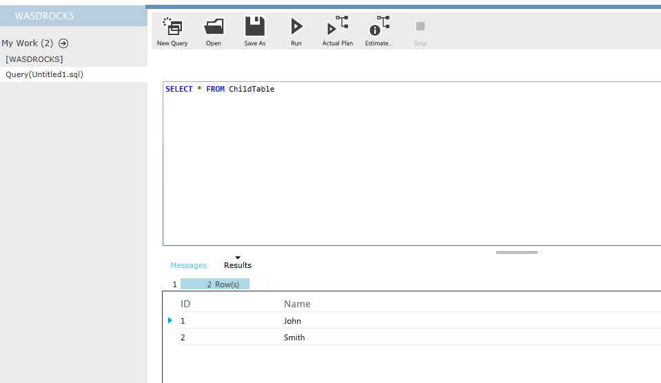 So, we have a database called WASDRocks with a table named ChildTable. The table as 2 records as shown below