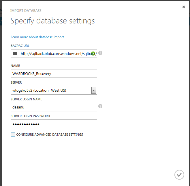 Storage account needs to be selected along with container details and once the credentials are entered correctly(Real time check of passwords !!!) the .BACPAC will be available.
