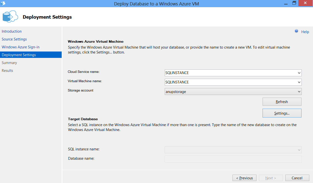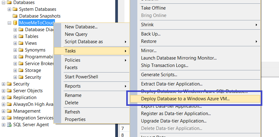 1. Right click database “MoveMeToCloud” and choose tasks and then Deploy Database to Windows Azure VM (Oops, that named needs to be changed too!)