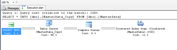 --Turn on Actual Execution Plan SET STATISTICS TIME ON GO SELECT * INTO [dbo].[MasterData_Copy] FROM [dbo].[MasterData]