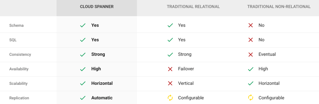 As per Google, Cloud Spanner is a No-Compromise Relational Database Service and it is the first and only relational database service that is both strongly consistent and horizontally scalable. With Cloud Spanner you enjoy all the traditional benefits of a relational database: ACID transactions, relational schemas (and schema changes without downtime), SQL queries, high performance, and high availability. But unlike any other relational database service, Cloud Spanner scales horizontally, to hundreds or thousands of servers, so it can handle the highest of transactional workloads. With automatic scaling, synchronous data replication, and node redundancy, Cloud Spanner delivers up to 99.999% (five 9s) of availability for mission critical applications.