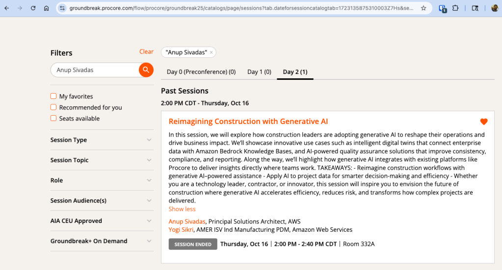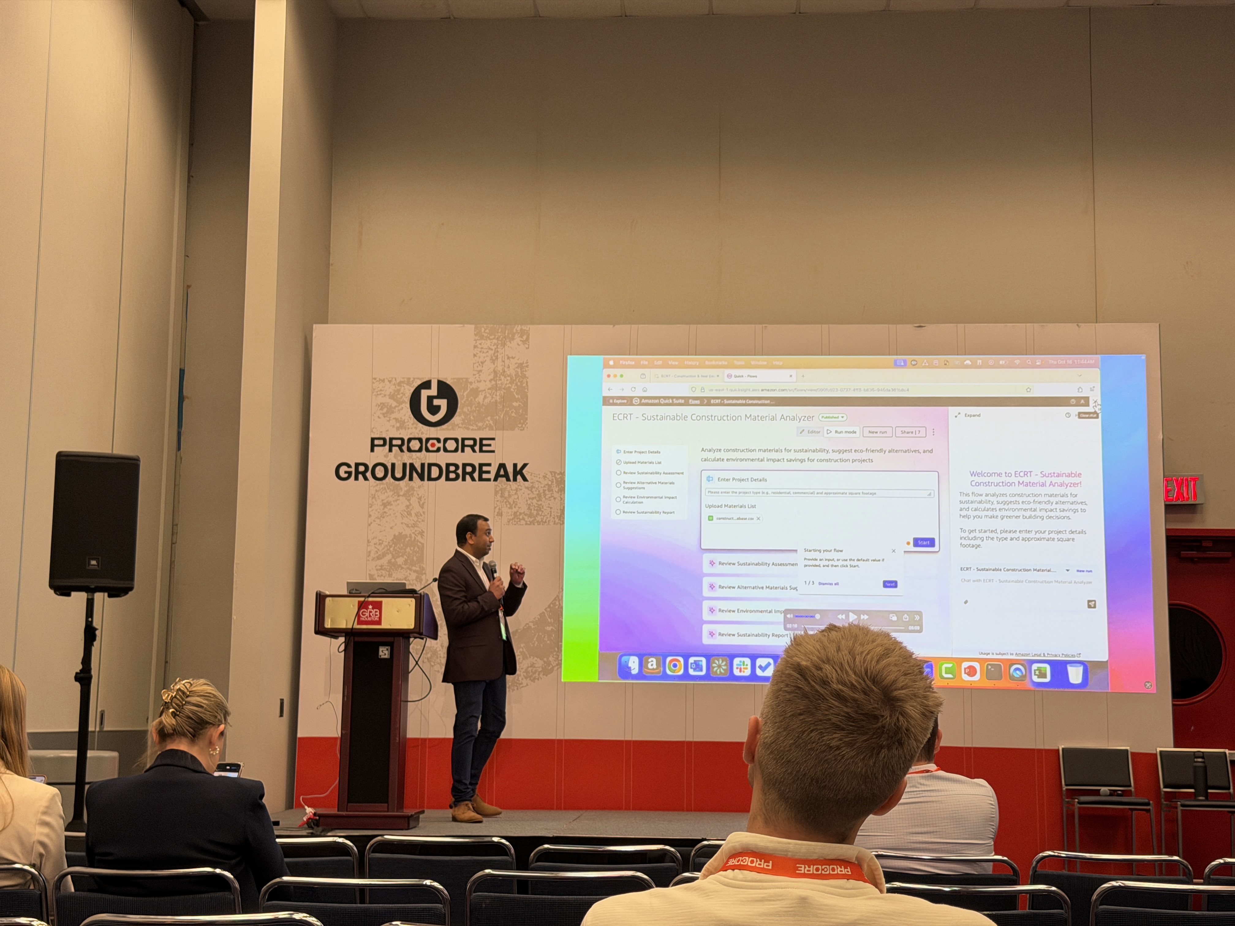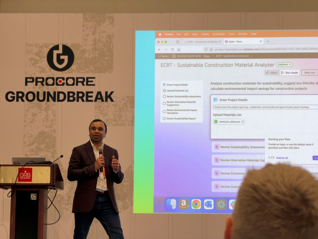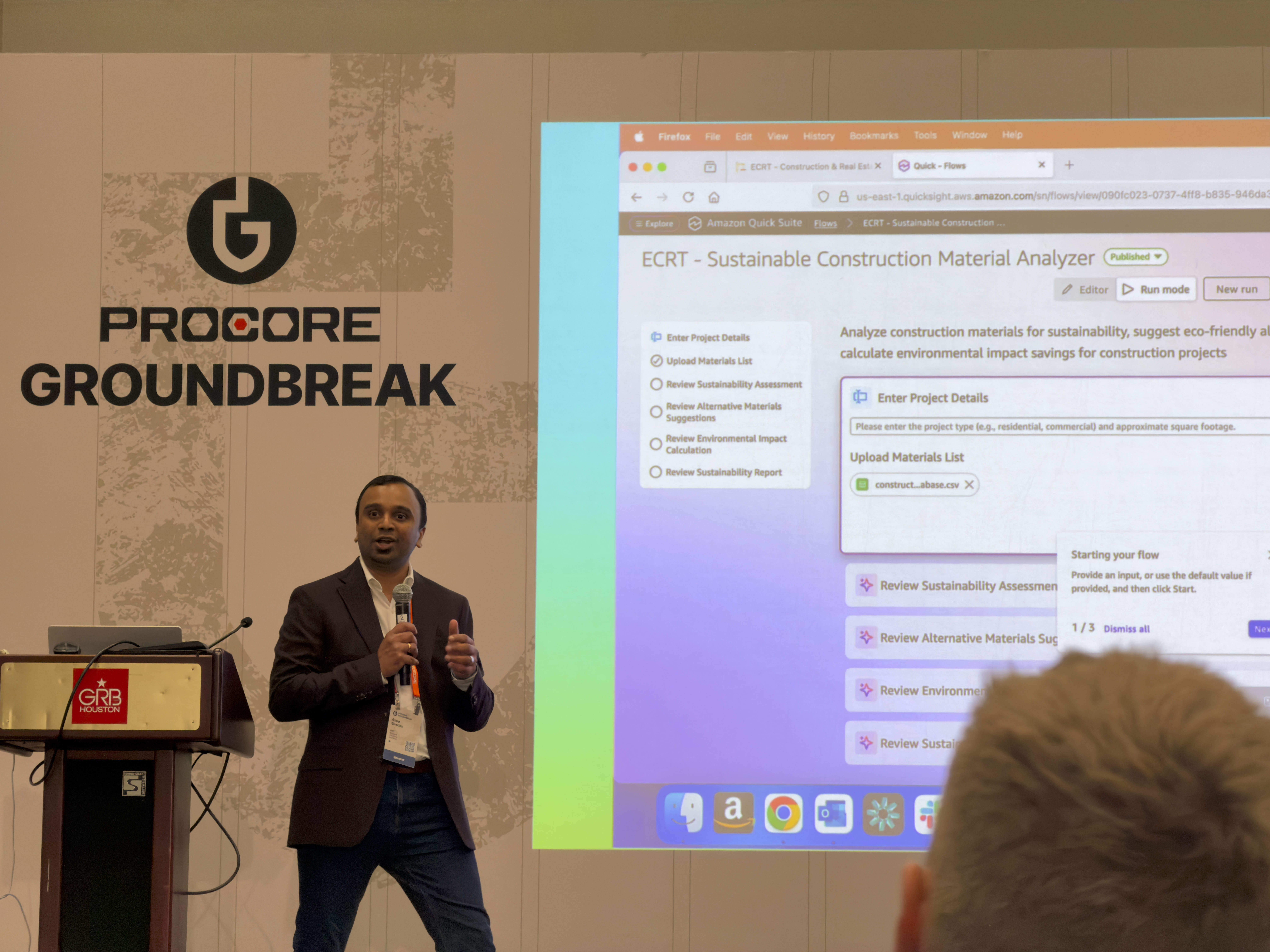 My Breakout session titled “Reimagining Construction with Generative AI” showcased five innovative industry-specific demonstrations designed to ignite interest in AI applications within construction. These demonstrations encompassed Construction Digital Twin & Generative AI integration, Automated Quality Assurance reporting, Workplace Safety for Construction, Agentic Phase & Project Management, and Construction Invoice Quick Suite Chat Agent & Sustainable Material Analyzer QuickSuite Flows.