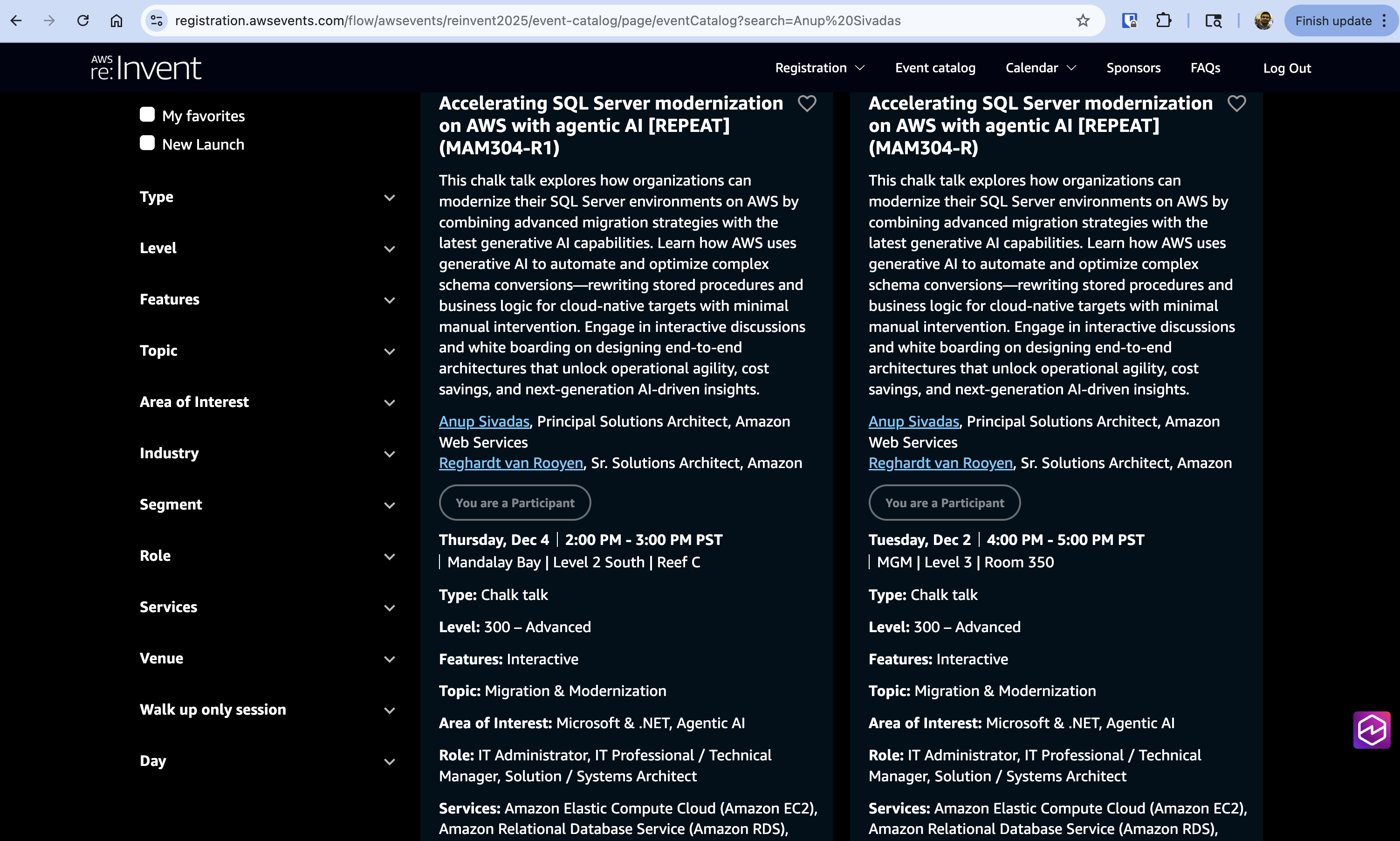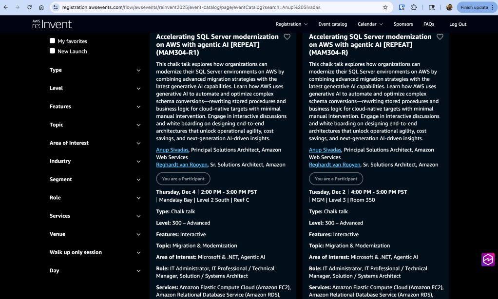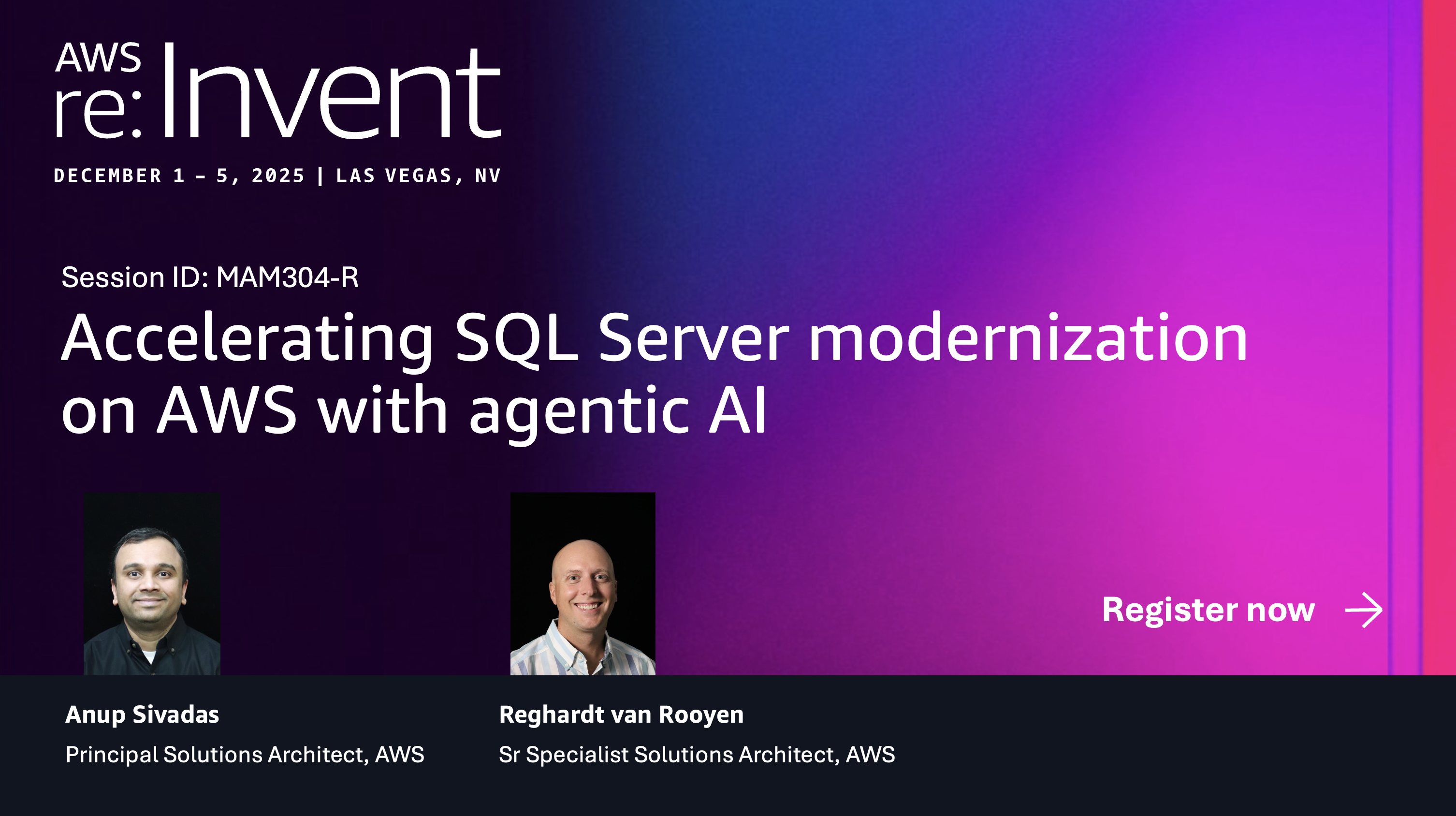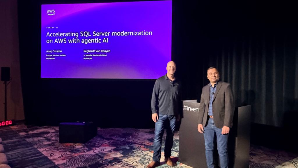In my talk, “Accelerating SQL Server Modernization on AWS with Agentic AI(MAM304-R),” I explored how customers can harness AI agents for discovery, reporting, and code transformation, and provided an in-depth look at the new AWS Transform feature for full-stack Windows modernization. The session took place on December 2 at MGM, with a repeat session held on December 4 at Mandalay Bay.